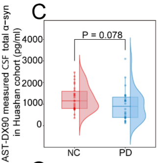 在本研究中,Dx-90平臺為揭示PD病理機制提供了重要支持。基于單分子免疫檢測技術檢測腦脊液(CSF)中的總α-syn水平變化:結果顯示PD患者CSF中總α-syn水平降低,這可能反映了腦內α-syn聚集的增加。